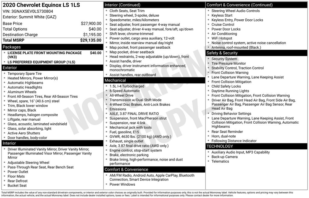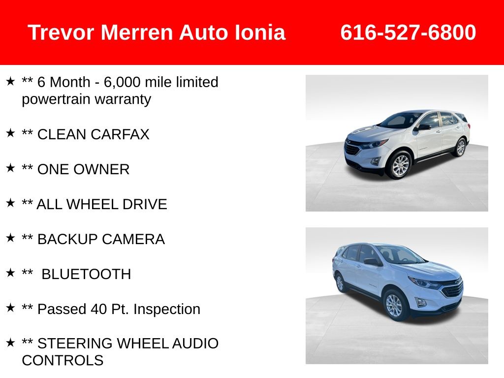 ** 6 Month - 6,000 mile limited powertrain warranty, ** CLEAN CARFAX, ** ONE OWNER, ** ALL WHEEL DRIVE, ** BACKUP CAMERA, ** BLUETOOTH, ** Passed 40 Pt. Inspection, ** STEERING WHEEL AUDIO CONTROLS, ** ALLOY WHEELS, ** MULTI-ZONE CLIMATE CONTROL, ** USB PORT, ** AUX JACK, ** 2 KEYS, ** APPLE CARPLAY/ANDROID AUTO, 17" Aluminum Wheels, 2 Rear USB Charging-Only Ports, 2 USB Ports & Auxiliary Input Jack, 3.87 Final Drive Axle Ratio, 4-Way Manual Driver Seat Adjuster, 4-Wheel Disc Brakes, 6 Speaker Audio System Feature, 6 Speakers, ABS brakes, Air Conditioning, Alloy wheels, AM/FM radio, Apple CarPlay/Android Auto, Auto High-beam Headlights, Bluetooth® For Phone, Brake assist, Bumpers: body-color, Compass, Delay-off headlights, Driver door bin, Driver vanity mirror, Dual front impact airbags, Dual front side impact airbags, Electronic Stability Control, Emergency communication system: OnStar and Chevrolet connected services capable, Four wheel independent suspension, Front anti-roll bar, Front Bucket Seats, Front Center Armrest, Front Passenger 4-Way Manual Seat Adjuster, Front reading lights, Fully automatic headlights, Heated door mirrors, Illuminated entry, Low tire pressure warning, Occupant sensing airbag, Outside temperature display, Overhead airbag, Overhead console, Panic alarm, Passenger door bin, Passenger vanity mirror, Power door mirrors, Power steering, Power windows, Preferred Equipment Group 1LS, Premium audio system: Chevrolet Infotainment 3, Premium Cloth Seat Trim, Radio data system, Radio: Chevrolet Infotainment 3 System w/AM/FM, Rear anti-roll bar, Rear reading lights, Rear seat center armrest, Rear window defroster, Rear window wiper, Remote keyless entry, Security system, SiriusXM Radio Delete, Speed control, Speed-sensing steering, Split folding rear seat, Spoiler, Steering wheel mounted audio controls, Tachometer, Telescoping steering wheel, Tilt steering wheel, Traction control, Trip computer, Variably intermittent wipers.