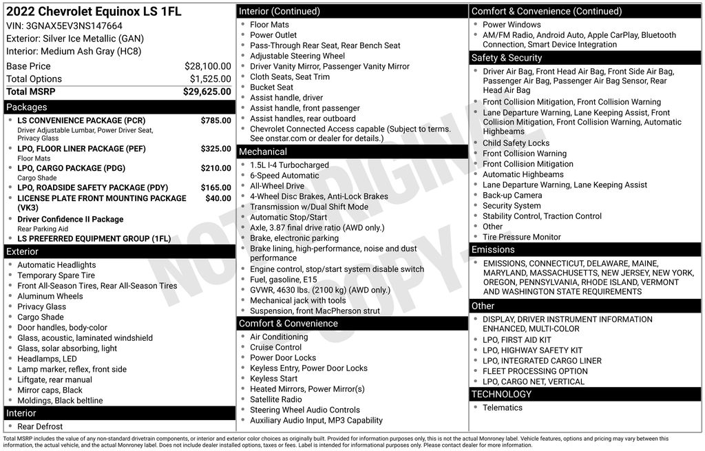 ** 6 Month - 6,000 mile limited powertrain warranty, ** ALL WHEEL DRIVE, ** BACKUP CAMERA, ** BLUETOOTH, ** Passed 40 Pt. Inspection, ** STEERING WHEEL AUDIO CONTROLS, ** POWER SEAT, ** USB PORT, ** AUX JACK, ** 2 KEYS, ** APPLE CARPLAY/ANDROID AUTO, 2-Way Power Driver Lumbar Control Seat Adjuster, 8-Way Power Driver Seat Adjuster, All-Weather Floor Liners (LPO), Cargo Package (LPO), Deep-Tinted Rear Glass, First Aid Kit (LPO), Floor Liner Package (LPO), Highway Safety Kit, Integrated Cargo Liner (LPO), LS Convenience Package, Multi-Color Enhanced Driver Instrument Info Display, Preferred Equipment Group 1FL, Retractable Cargo Shade, Roadside Safety Package (LPO), Vertical Cargo Net (LPO).