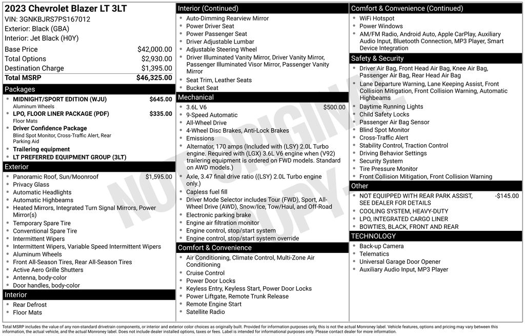 This is one impressive car. I purchased the Chevrolet Blazer with 6 cylinder engine. It has everything I want. Great acceleration, Great styling, Quiet engine, Well equiped, I really like the turn signals in the mirrors, push button start, blind spot monitoring, cross traffic monitoring, Continental Tires, and easy pairing of cell phone. I did not get AWD or GPS. There is nothing, I would change and for the price, a great deal to boot. You won't be disappointed. - 5.0