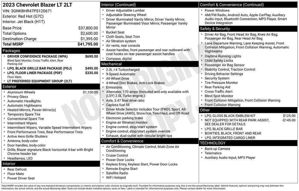 This is one impressive car. I purchased the Chevrolet Blazer with 6 cylinder engine. It has everything I want. Great acceleration, Great styling, Quiet engine, Well equiped, I really like the turn signals in the mirrors, push button start, blind spot monitoring, cross traffic monitoring, Continental Tires, and easy pairing of cell phone. I did not get AWD or GPS. There is nothing, I would change and for the price, a great deal to boot. You won't be disappointed. - 5.0
