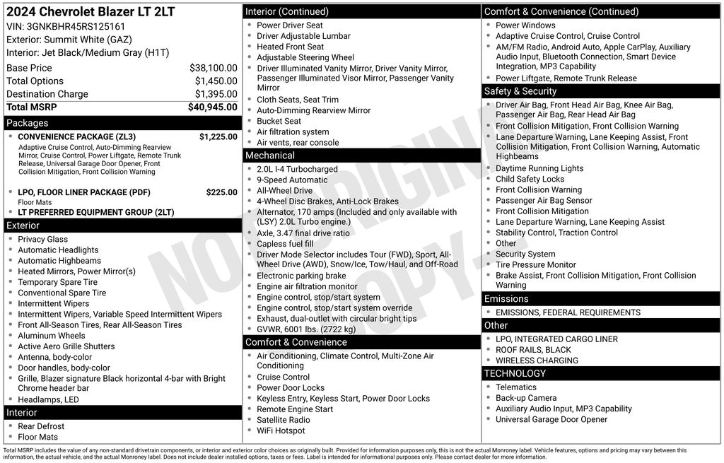 This is one impressive car. I purchased the Chevrolet Blazer with 6 cylinder engine. It has everything I want. Great acceleration, Great styling, Quiet engine, Well equiped, I really like the turn signals in the mirrors, push button start, blind spot monitoring, cross traffic monitoring, Continental Tires, and easy pairing of cell phone. I did not get AWD or GPS. There is nothing, I would change and for the price, a great deal to boot. You won't be disappointed. - 5.0